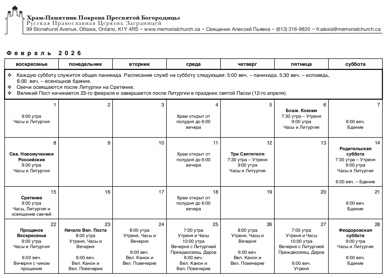 Расписание богослужений на февраль