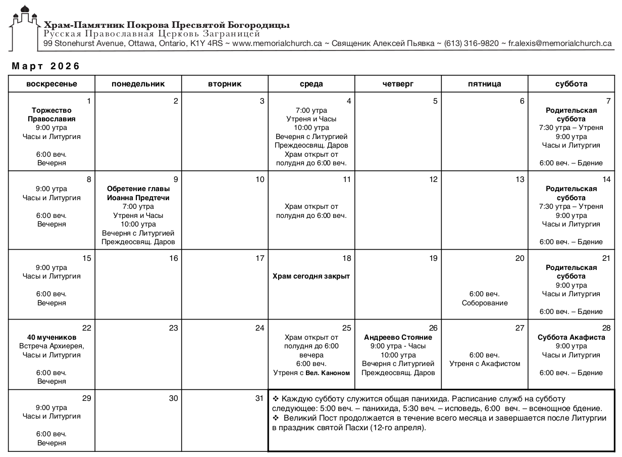 Расписание богослужений на март